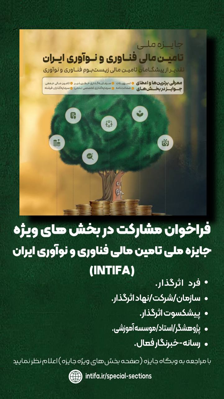 فراخوان نظرسنجی بخش های ویژه جایزه ملی تامین مالی فناوری و نوآوری ایران (INTIFA) از سوی دبیرخانه جایزه اعلام شد. به گزارش روابط عمومی انجمن سرمایه گذاری خطرپذیر ایران، دبیرخانه جایزه ملی تامین مالی فناوری و نوآوری ایران جزئیات بخش های ویژه